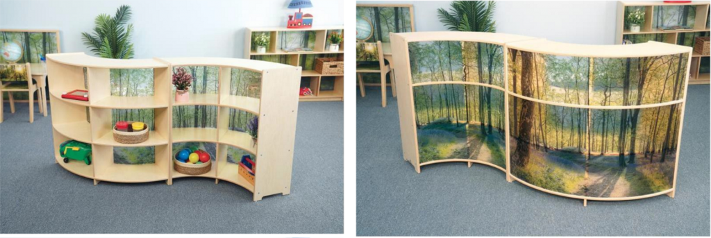 The curve-in and curve-out cabinets join the Nature View Serenity series, an assortment of 36-inch high straight and curved divider panels, storage cabinets, and activity centers depicting a brilliant forest image that intentionally draws the attention of children and fundamentally changes how they engage a space.