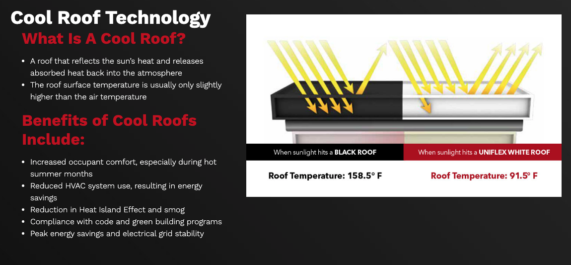 If you live in a hot climate, UNIFLEX roofing systems can help in multiple ways. You can save on energy usage and satisfy compliance codes, especially when the weather is hot year-round.